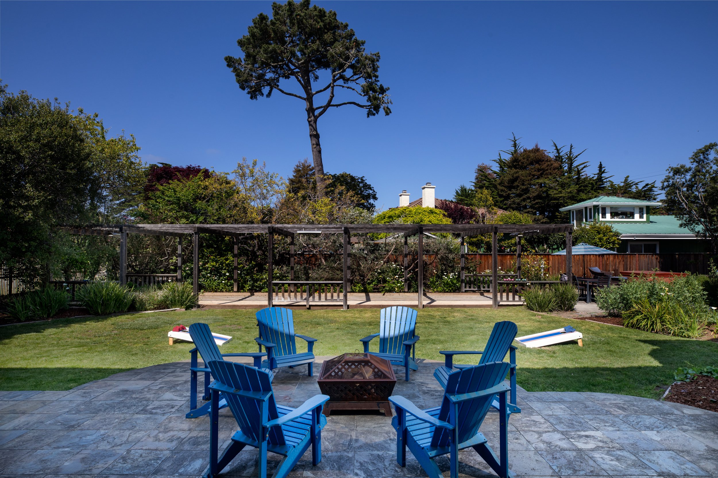 Outside, the allure of coastal living is brought to life with a second-story balcony off the main living area boasting a beadboard ceiling, recessed lighting, and three outdoor heaters. A crescent moon bench seating area invites contemplative moments under the stars, while a fenced backyard oasis beckons with its mature landscaping, bocci court, slate patio area, raised Trex deck with floor lighting, a hot spa Jacuzzi, and an outdoor shower—an invitation to unwind and reconnect with nature. This Aptos beach home marries coastal charm with modern luxury, offering an unparalleled lifestyle defined by beauty, comfort, and tranquility.